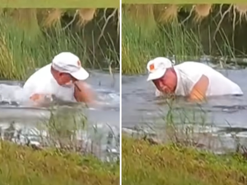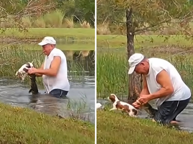 A 74-year-old man, Louise Willbanks, jumped into a pond full of alligators without a second thought to rescue his 3-month-old Spaniel, Gunner, when an alligator raced up from the nearby pond and grabbed the dog.